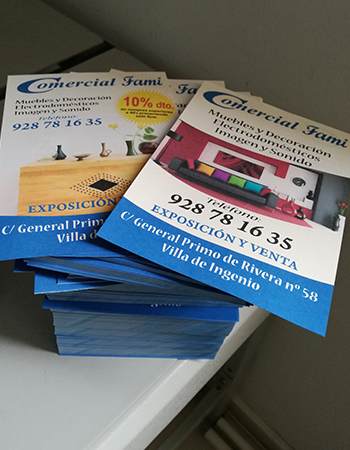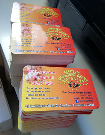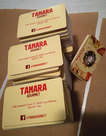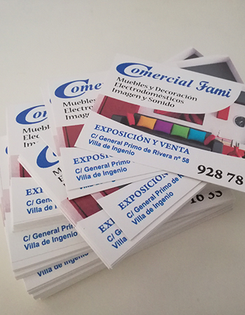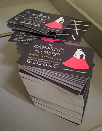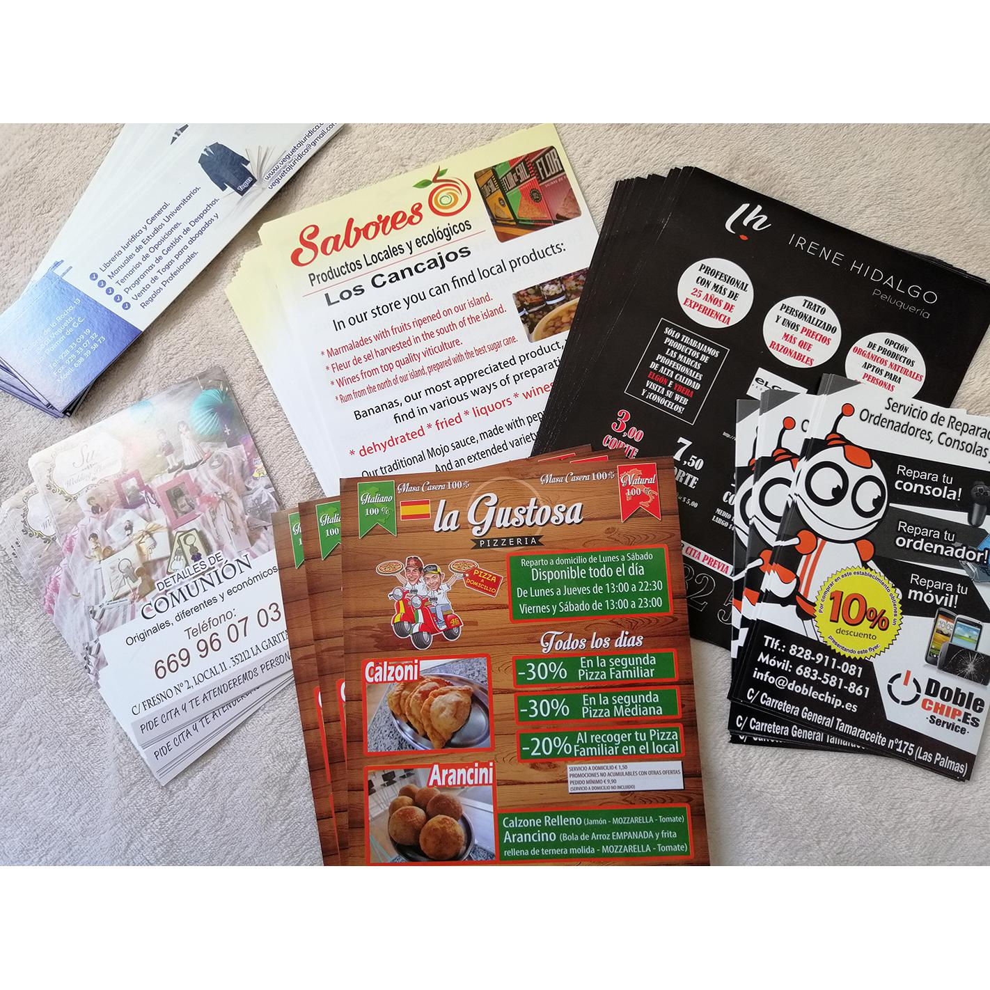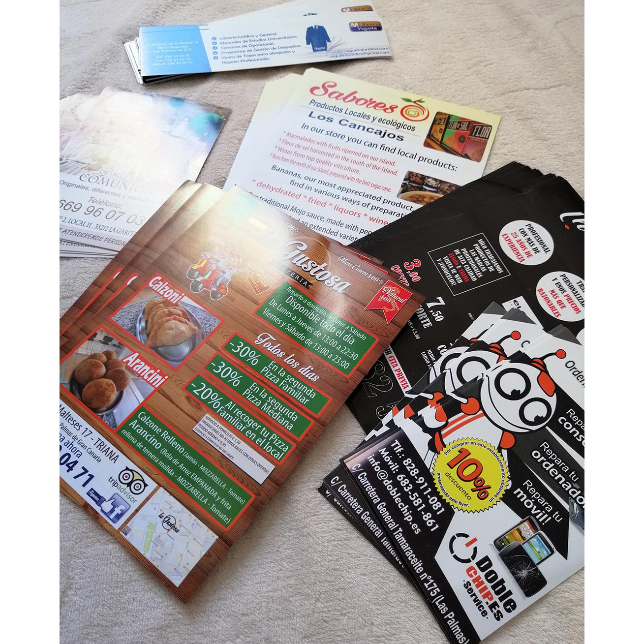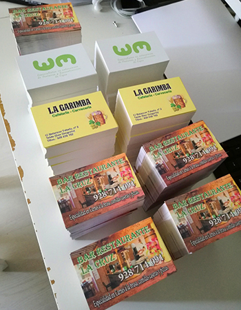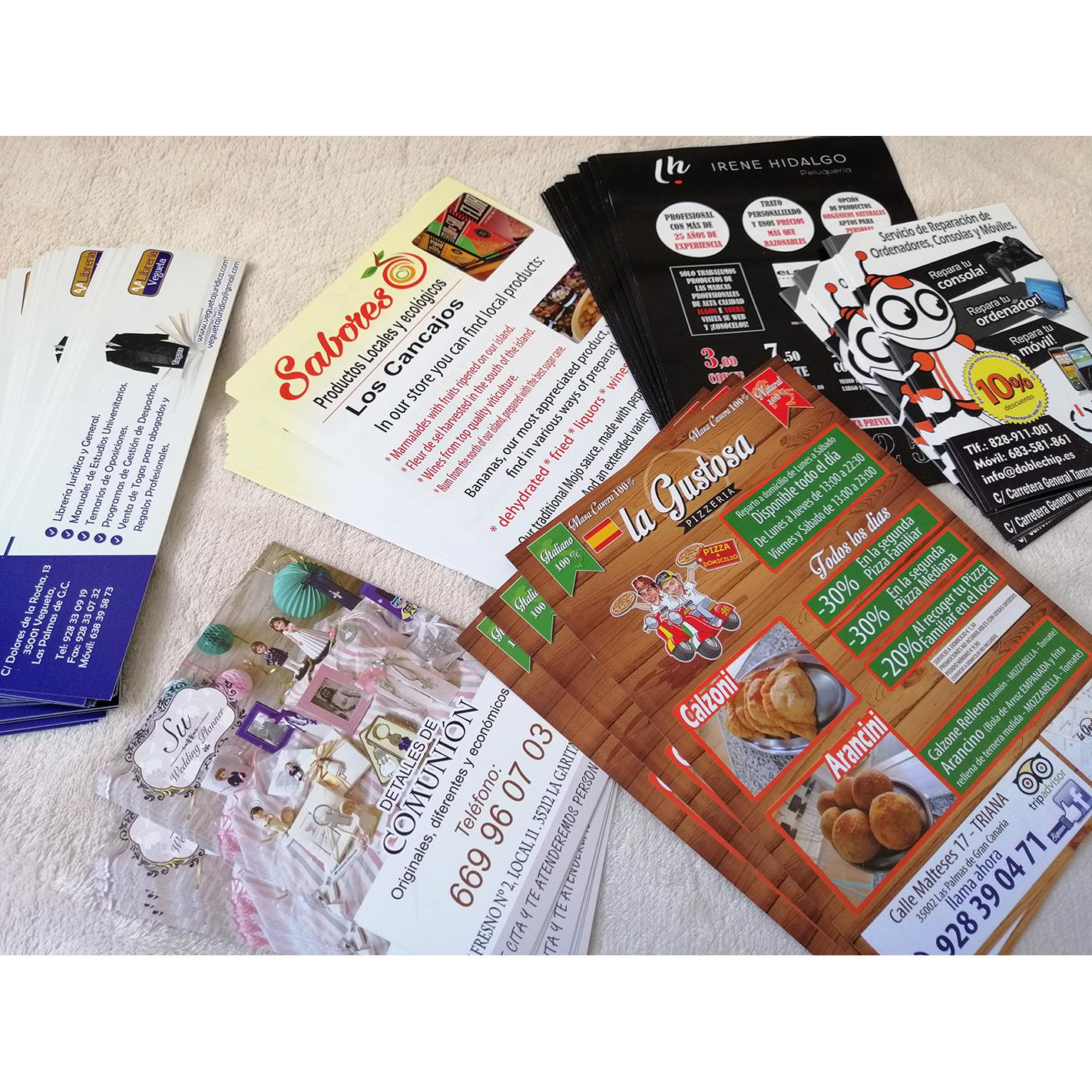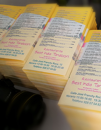 Impresión de Tarjetas de visita, Flyers, cartas de menú y pegatinas para buzoneo en grandes cantidades para tiendas de Canarias.